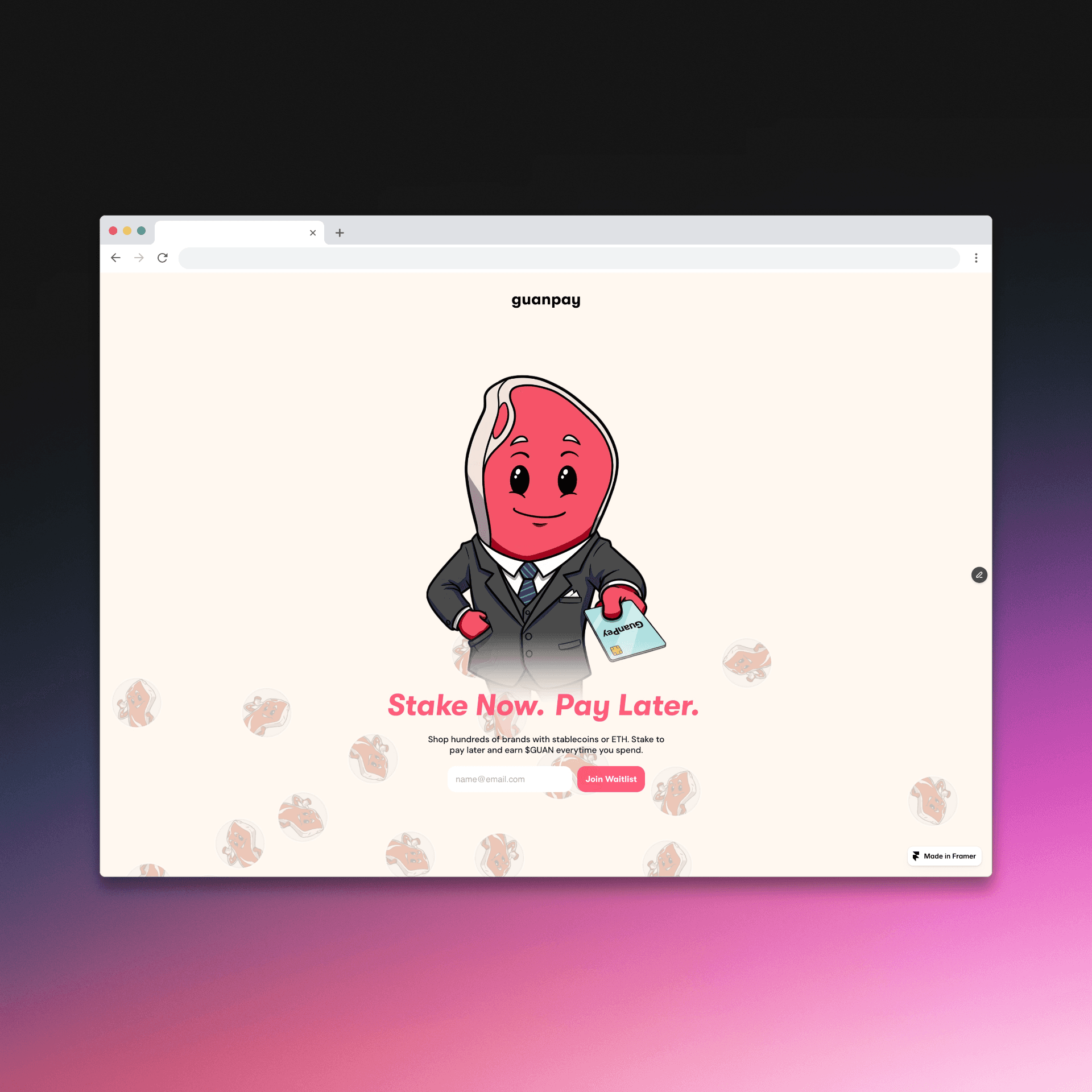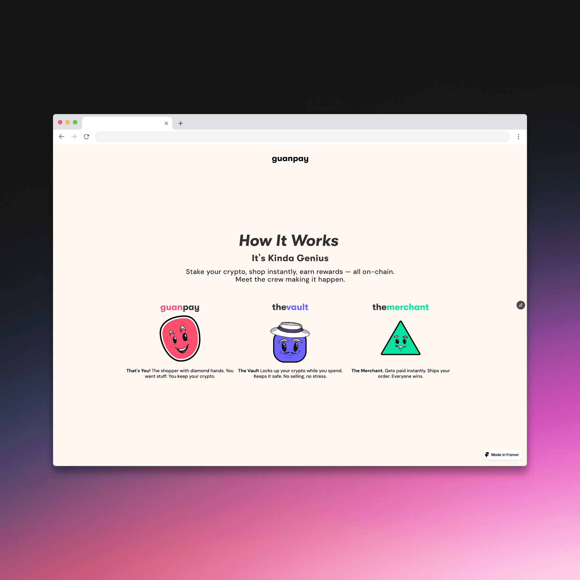 GuanPay went from a whitepaper with a novel DeFi mechanic to a fully branded product with a clear identity and user model. The character-driven brand gives the protocol a distinct voice in a space full of generic DeFi interfaces, and the Framer landing page gave the team a live marketing presence while the product was still in development.