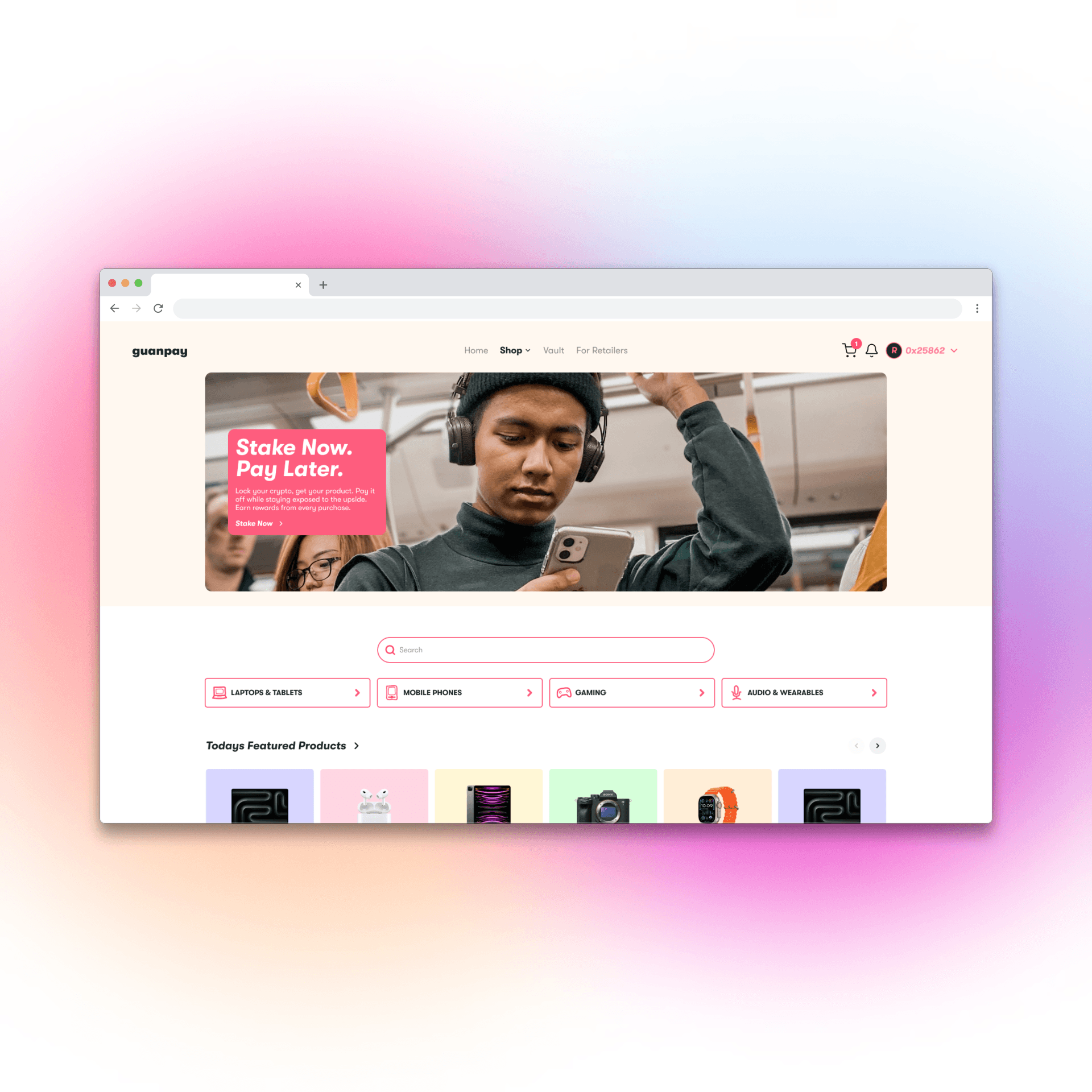 GuanPay is a crypto payments protocol built on Base that lets users buy real-world products without selling their crypto. Instead of converting ETH to cash, users lock collateral in a vault, get spending power on a marketplace, and repay later to unlock their assets. The protocol calls this "stake-to-own."